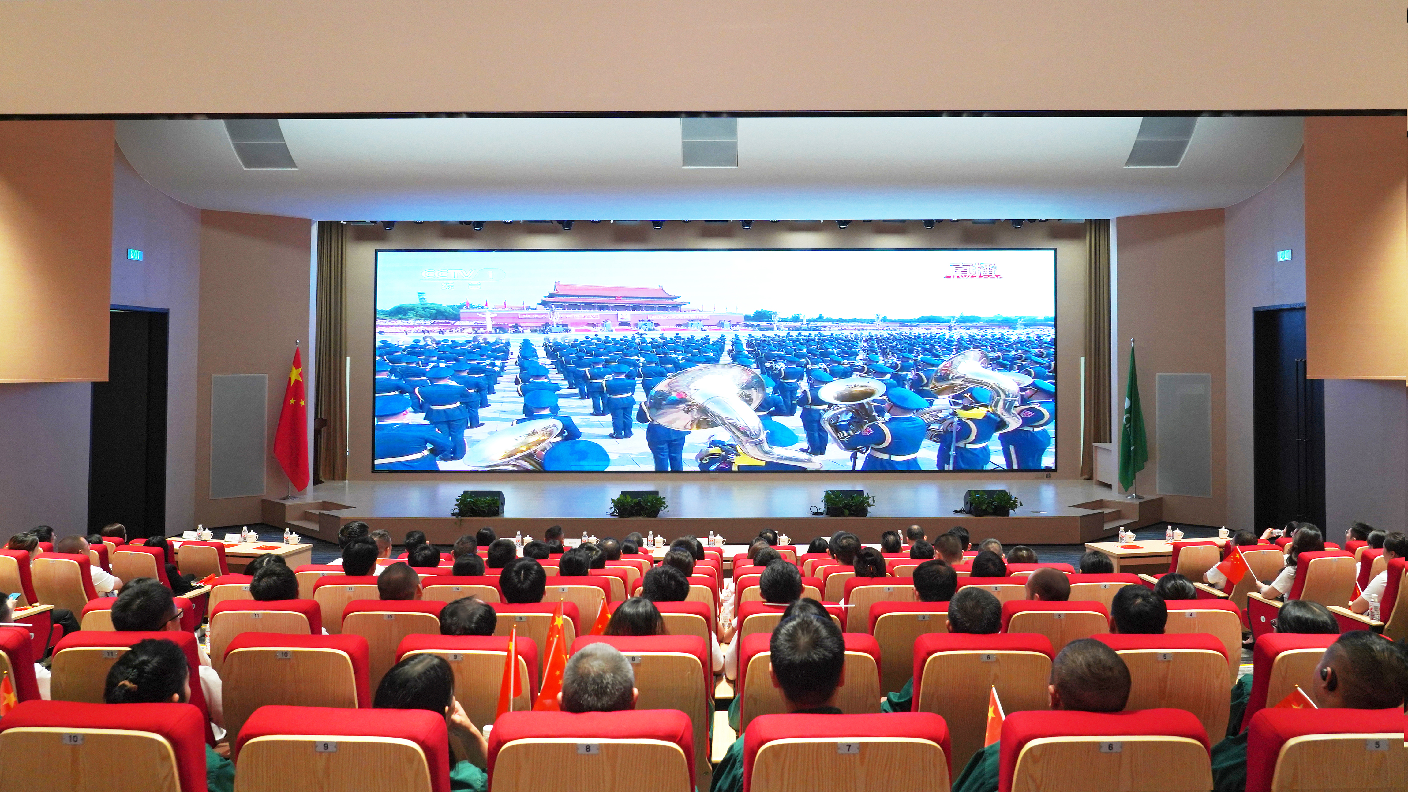 上午9時,報告廳內燈光漸暗,全體員工整齊就座。隨著紀念大會正式開始,大屏幕上呈現出天安門廣場的莊嚴畫面,人民英雄紀念碑在朝陽下莊嚴挺立,十萬軍民肅立無聲。當國歌奏響時,全體鑫政人起立高唱國歌,肅穆之情彌漫整個會場。在兩個多小時的直播過程中,會場始終保持莊重肅穆的氛圍,不時響起的自發掌聲,傳遞著鑫政人心中的感動與自豪。